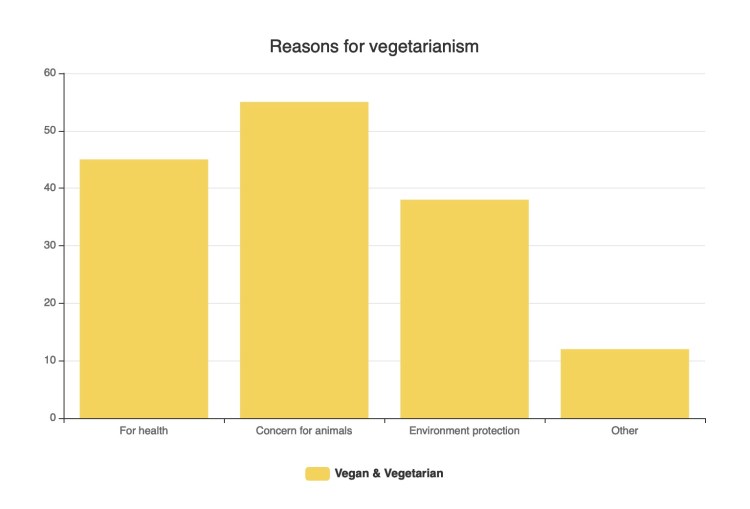 About 60 percent of vegans and 40 percent of vegetarians (who eat eggs, fish, shrimp and dairy) said they had adopted such a lifestyle in the past five years, with 55 percent citing concern for animals, 45 percent for health reasons and 38 percent for protecting the environment.