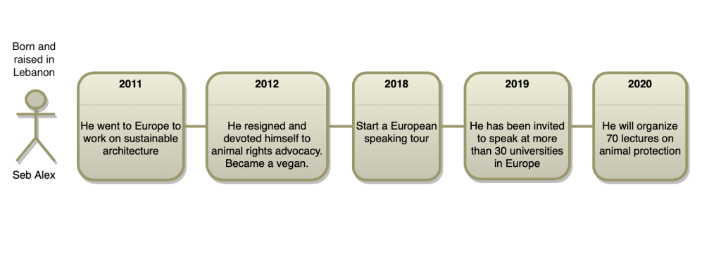 In 2019, he was invited to speak about Animal Exploitation & Sustainability in more than 30 universities and schools, reaching more than 2200 students between the ages of 13 and 30.